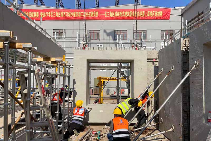 競賽是在上海市住房和城鄉(xiāng)建設管理委員會、上海市人力資源和社會保障廳、上海市總工會等政府主管部門以及長三角區(qū)域新型建筑工業(yè)化協(xié)同發(fā)展聯(lián)盟具體指導和支持下,由上海市建設協(xié)會、上海市建筑施工行業(yè)協(xié)會、上海市混凝土行業(yè)協(xié)會、上海市金屬結構行業(yè)協(xié)會和上海市技師協(xié)會聯(lián)合舉辦,來自本市裝配式建筑設計、施工、生產等的優(yōu)秀企業(yè)中近80支參賽隊300余名選手參加了本次比賽。
