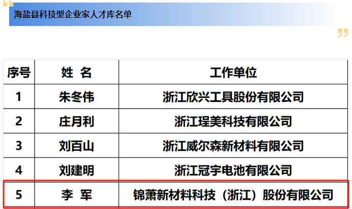 5月28日下午,嘉興海鹽圍繞“弘揚科學家精神,勇當高水平科技自立自強排頭兵”活動主題舉辦了系列主場活動,正式公布了海鹽縣科技型企業家人才庫名單、海鹽縣最具創新力青年科技型企業家人才庫名單,共25位優秀企業家入庫,錦蕭科技董事長兼總經理李軍榜上有名。