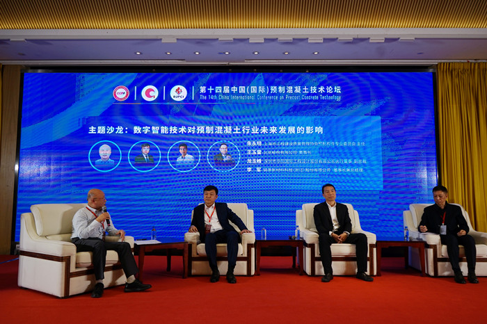 最后的主題沙龍環節,上海市工程建設質量管理協會預制構件專業委員會主任朱永明,北京榆構有限公司董事長王玉雷,深圳市華陽國際工程設計股份有限公司執行董事、副總裁龍玉峰錦蕭新材料科技(浙江)股份有限公司總工程師王建忠,4位專家圍繞“數字智能技術對預制混凝土行業未來發展的影響”這一主題,結合實戰經驗,圍繞數智技術、綠色技術的發展對裝配式產業未來的影響,各抒己見,給出了中肯的意見和建議。