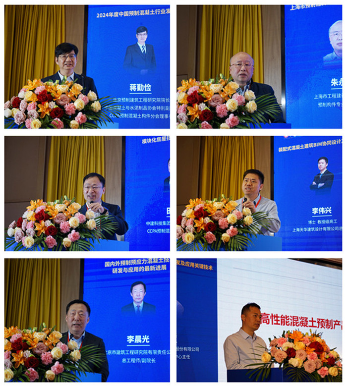 隨后的專家報告環節,中國混凝土與水泥制品協會特別副會長、預制混凝土構件分會理事長、北京預制建筑工程研究院院長蔣勤儉,上海市工程建設質量管理協會預制構件專業委員會主任朱永明,中建科技集團有限公司副總工程師、中國混凝土與水泥制品協會預制混凝土構件分會秘書長田春雨,上海天華建筑設計有限公司總工程師李偉興,北京市建筑工程研究院有限責任公司總工程師、副院長李晨光,上海建工建材科技集團有限公司副總工程師、技術中心主任朱敏濤,分別作《2024年度中國預制混凝土行業發展報告》、《上海預制混凝土構件行業創新與發展探索》、《模塊化房屋技術體系與工程應用》、《裝配式混凝土建筑BIM協同設計及案例分析》、《國內外預制預應力混凝土技術研發與應用的最新進展》、《高性能混凝土預制產品開發及應用關鍵技術》的報告分享。