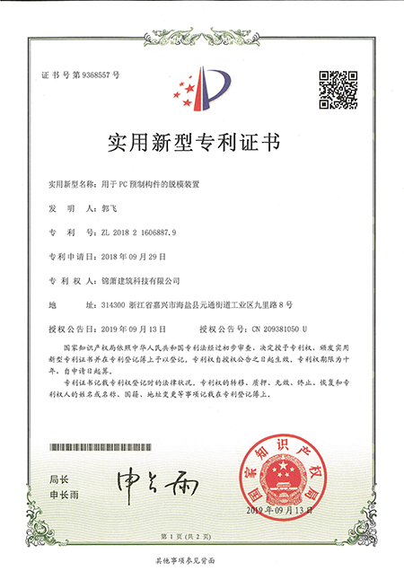 專利證書--用于PC預制構(gòu)件的脫模裝置
